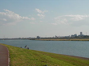 対岸の江戸川区方面を見る。高いビルが見える辺りは地下鉄都営新宿線の篠崎辺りか(?)