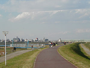市川側の江戸川サイクリングコース。川下から市川パークシティ(マンション)方面を見る。