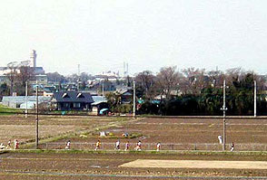 程なく土手下、埼玉側の田園地帯を見ると、この強風の中、長く伸びたおかしな一団が北風に向かって走っている!