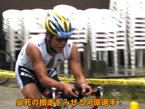 トランジションで益田選手に先行し、バイクスタート後5km付近で三木選手をパス