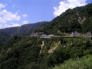 ↑雪崩・崖崩れ避けのスノーシェッドが続く!冬場は雪で通行止めになる!